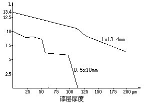 每涂刷一次油漆,待其干涸后,用千分尺测量漆层厚度(钢板总厚度减去事先测定的钢板板材厚度),并进行一次粉探伤测试,记录观察结果,然后再涂刷一遍油漆,重复上述步骤,直到漆层厚度达到198微米。由于一直是在同一个缺陷部位测试,可以避免人工缺陷、钢板厚度以及钢板材料成分和冶金组织变化造成的影响。